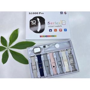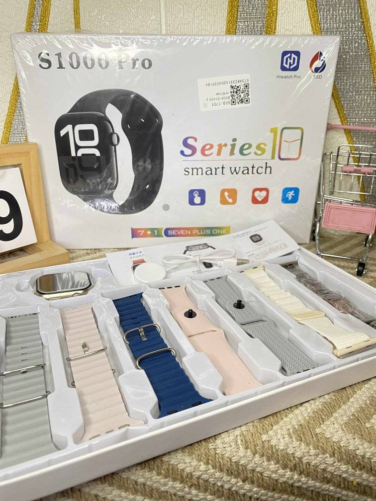 The S1000 Pro Series 10 Smart Watch is a feature-packed wearable designed for both men and women. With 7 interchangeable straps, it lets you match your watch to any occasion—fitness, work, or casual outings. Offering Bluetooth calling, fitness monitoring, and a sleek modern design, this smartwatch is built for style, health, and connectivity. Key Features: 7-in-1 Strap Edition: Includes 7 stylish straps for daily customization Wireless Magnetic Charging: Fast and convenient power-up Full Touch Display: Large, clear screen with smooth navigation Bluetooth Calling: Make and receive calls directly from your watch Smart Notifications: Stay updated with calls, messages, and app alerts Fitness & Health Tracking: Heart rate, sleep monitoring, step count, calorie tracking, and more Sports Modes: Multiple activity modes to support your workouts Water-Resistant Build: Suitable for everyday use Compatibility: Works with both Android and iPhone devices